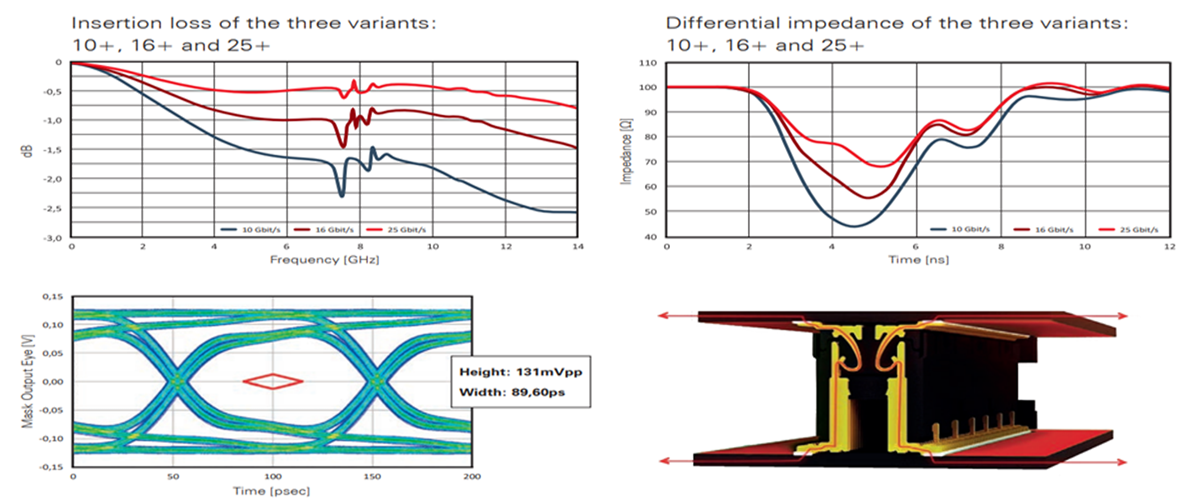 連接器系統在10、16 或 25 Gbps 下進行的模擬展示了一流的訊號完整性,這使得連接器系統成為高達 25 Gbps 及更高資料傳輸速率的應用的首選。