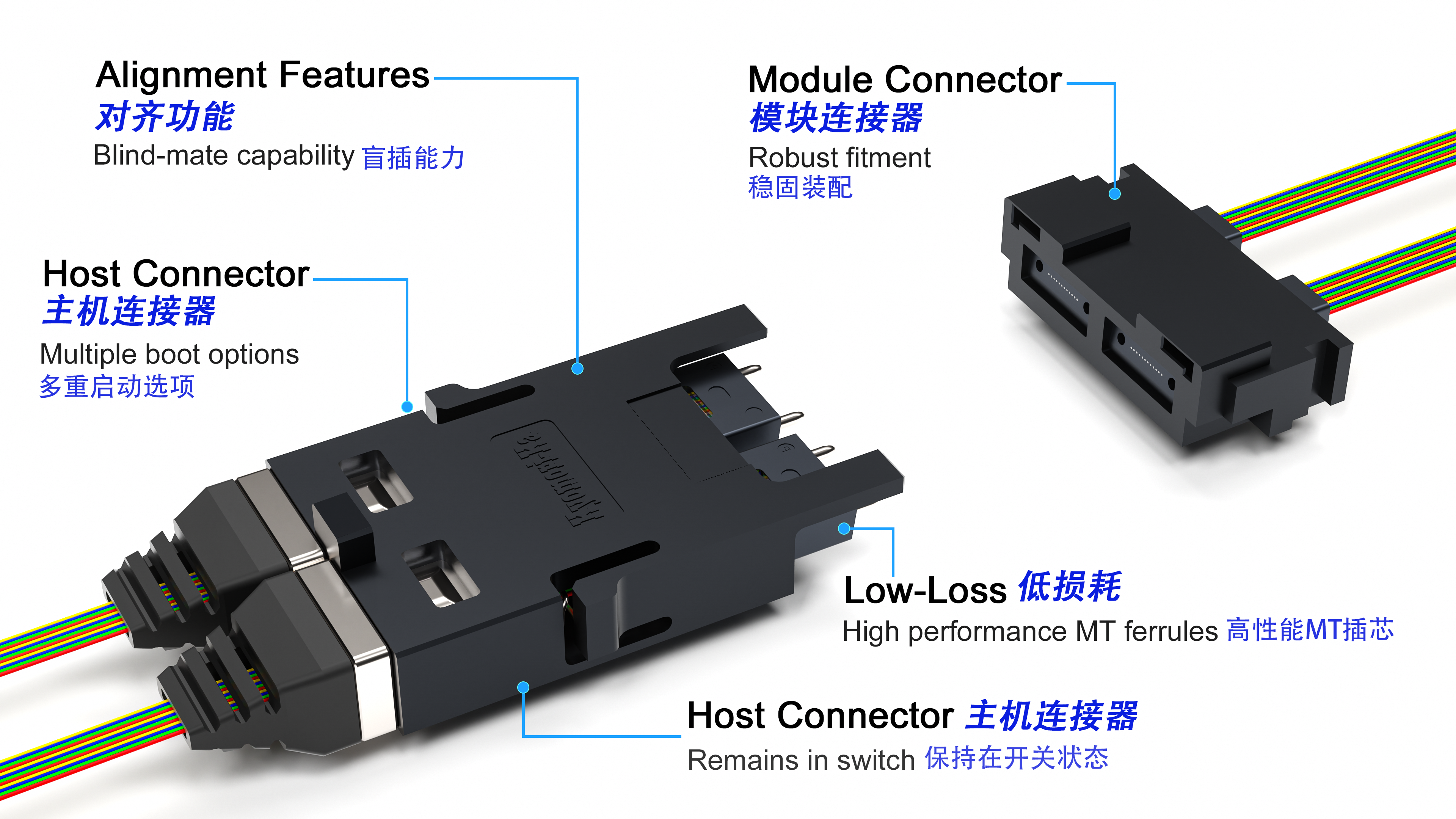 -核心优势- 该模块连接器采用创新的自对准技术,能够在插入时与已安装在CPO交换机PCB板上的主机 端连接器实现精准对接。单次连接即可完成两个低损耗MT插芯的精准盲插,显著提升系统 整体性能与运行可靠性。
