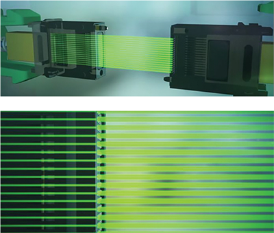 ◆使用堆疊的12通道帶狀光纖實現最多48個通道的通道數,或使用堆疊的16通道帶狀光纖實現最多64個通道的通道數。每秒兆兆位元頻寬能力,64 根單模光纖,25 GBit/s = 每個連接器 1.6 TBit/s。