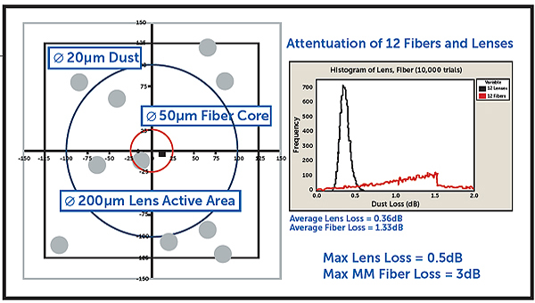 1. 光學配接介面所需的對準精度顯著降低。考慮有效耦合兩個單模光纖芯所需的對準,其有效模場直徑(MFD)在1310nm處為9.2微米。光纖芯之間的3微米偏移會導致1.8dB的衰減。現在考慮在配接介面處對擴展光束互連的相同對準偏移,其準直光斑尺寸約為90微米,功率分佈為高斯分佈。與相同3微米偏移相關的衰減為0.01dB。配接介面處對準精度的降低為與精密對準相關的對準特徵引入了新的選項。 2. 互連的自由空間特性消除了拋光光纖尖端物理接觸的需要。對於密集的多光纖互連,由於消除了嚴格控制的端面幾何形狀、製造流程以及最小化了套圈配合力,因此可以顯著節省成本 3. 將訊號擴展到更大的區域可以最大限度地減少因物理接觸損失而導致的光遮蔽和衰減的影響,從而減少碎片的影響。 |