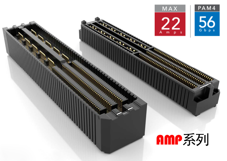 AMP系列連接器產品在單一連接器中整合了高密度、高速訊號和電源,支援64Gbps PAM4,電源接點(刀片)從正常位置旋轉90°,可改善散熱、簡化電路板佈線並提高設計靈活性和效率。業界密度最高的訊號和電源組合連接器。